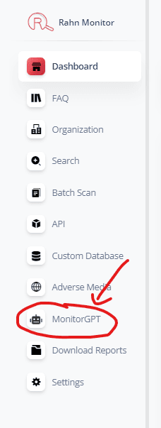 leftsidebar. This action will navigate you to a secure web application, enabling you to utilize MonitorGPT in a separate tab. For guidance, please refer to the provided diagram.