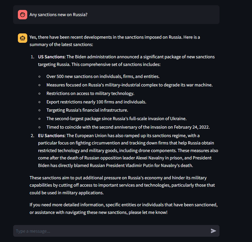 For instance, if you're investigating a sanctioned individual, using documents enables the AI to delve into extensive online repositories, fetching pertinent details from legal documents, media reports, and other relevant sources. This ensures a thorough and nuanced understanding of the subject matter.